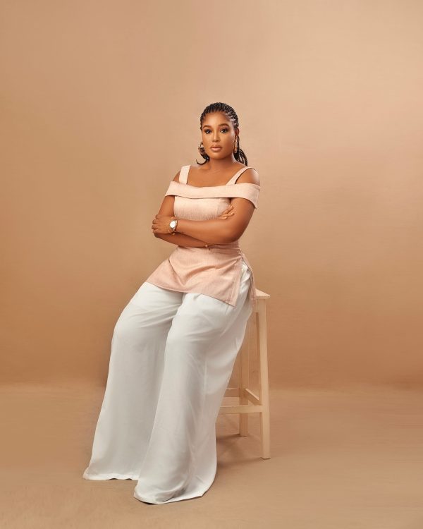 This black and white two-piece set, features a sleeveless peplum top and wide leg trousers adorned with subtle circular patterns.